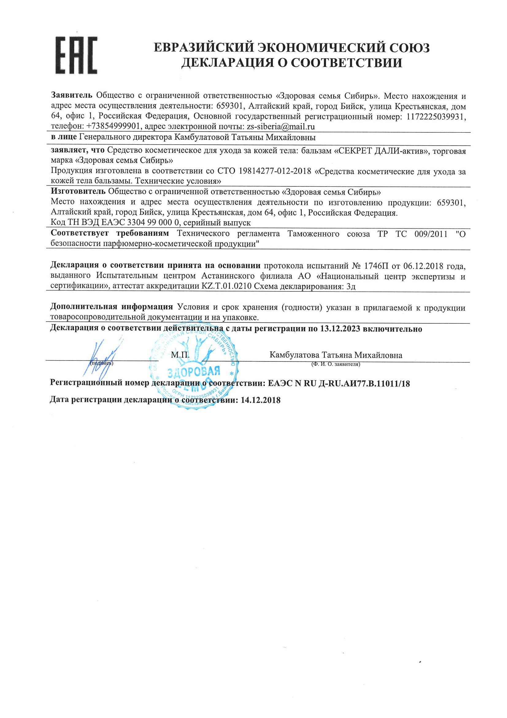 Производитель: ООО «Здоровая семья Сибирь», 659301, Алтайский край, г. Бийск, ул. Крестьянская 64, офис 1.