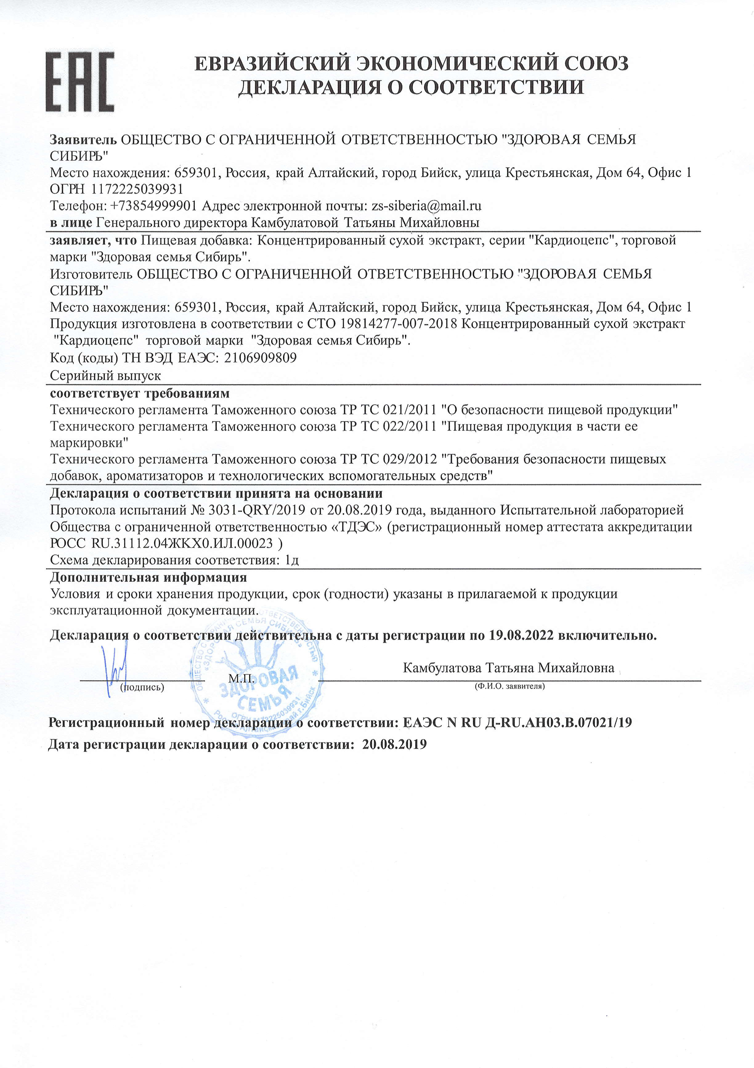 СТО 19814277-007-2018 Экстракты пищевые «Кардиоцепс» торговой марки «Здоровая семья Сибирь».